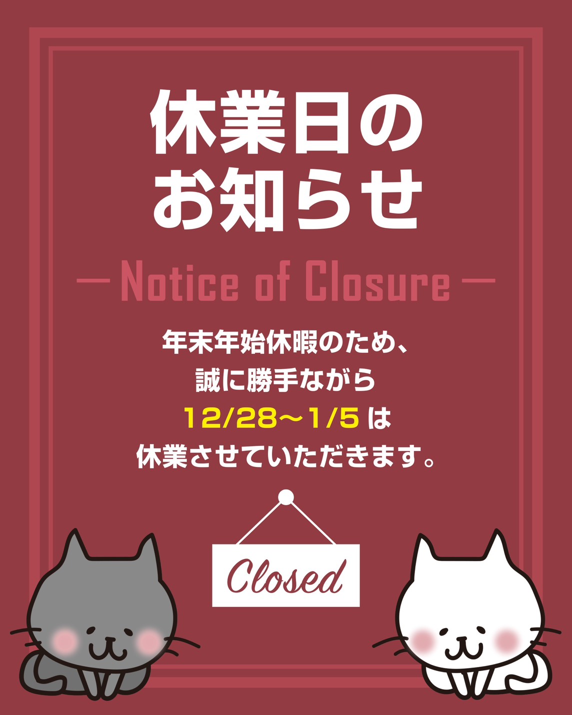 2025年12月28日~2026年1月5日は年末年始のため、